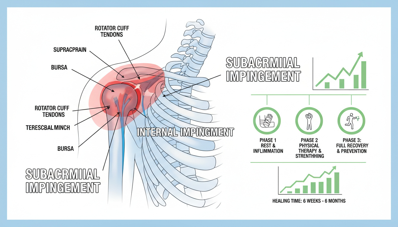 Impingement axel läkningstid är vanligtvis mellan två till tolv månader, med en rekommenderad aktiv viloperiod på 4–6 veckor, och behandling med fysioterapi under 3–6 månader. Artikeln presenterar bekräftade fakta, praktiska övningar, tester och expertråd från bland annat 1177, Capio och doktorn.com.